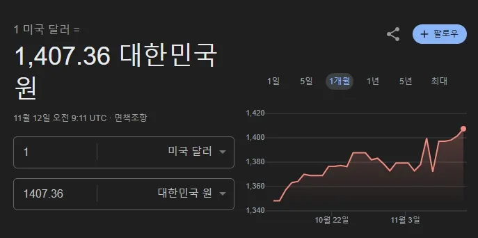 2024년 11월 12일 기준 약 1407원으로 미 대선일인 11월 5일에 약 1380원인 것을 생각하면 1주일만에 2% 가까이 상승하였습니다.